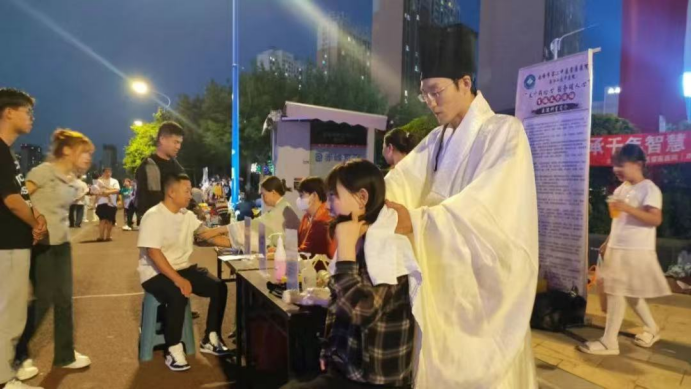 红山区西城街道的“月亮市集”中身着汉服的中医大夫为居民开展义诊活动