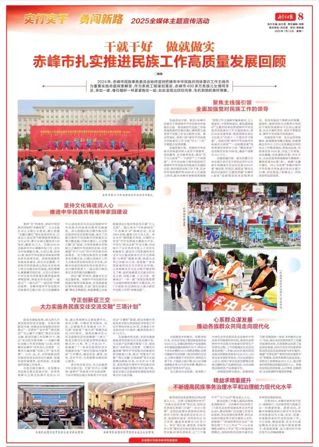 2024年,赤峰市民族事务委员会始终坚持把铸牢中华民族共同体意识工作主线作为重要实践命题探索解答、作为系统工程谋划落实,赤峰市400多万各族儿女情同手足、亲如一家,像石榴籽一样紧紧抱在一起,处处呈现出欣欣向荣、生机勃勃的美好景象。